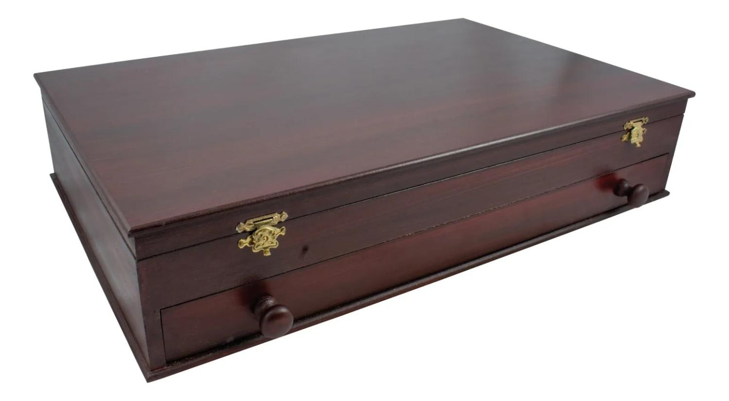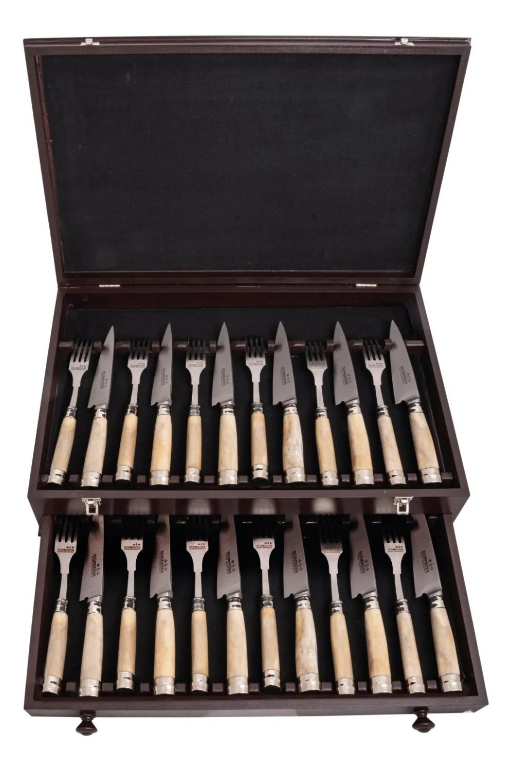 Juego De Tenedores y Cuchillos En Acero Inoxidable 5″ Por 24 Unidades, Encabados En Hueso Con Alpaca Y Caja De Madera Forrada En Pana